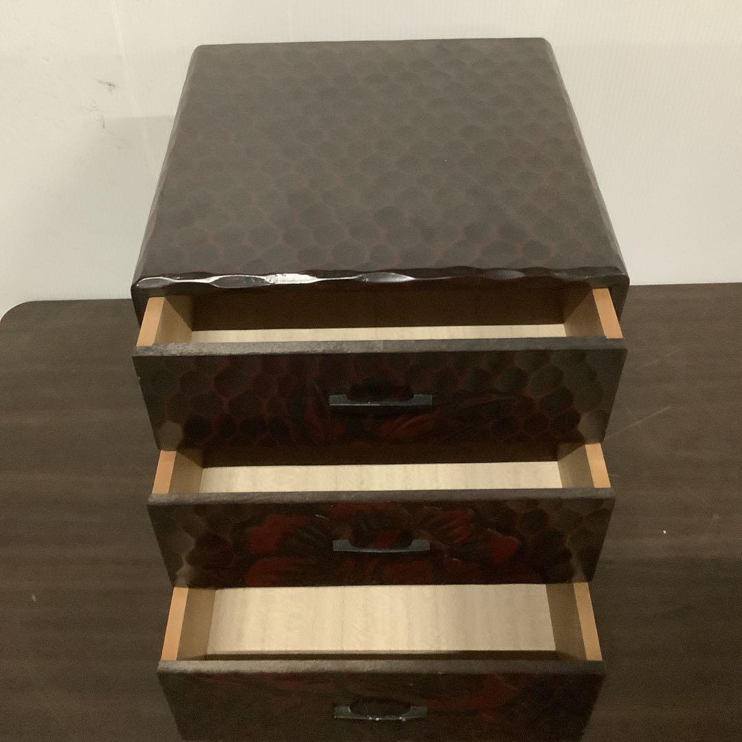 【送料無料】昭和レトロ 木製 小物入れ 3段 引き出し 花の彫刻 黒と赤